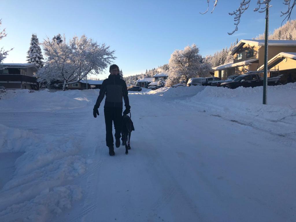Frozen whiskers, boots on and a winter coat that cost 13 times what mine did!
