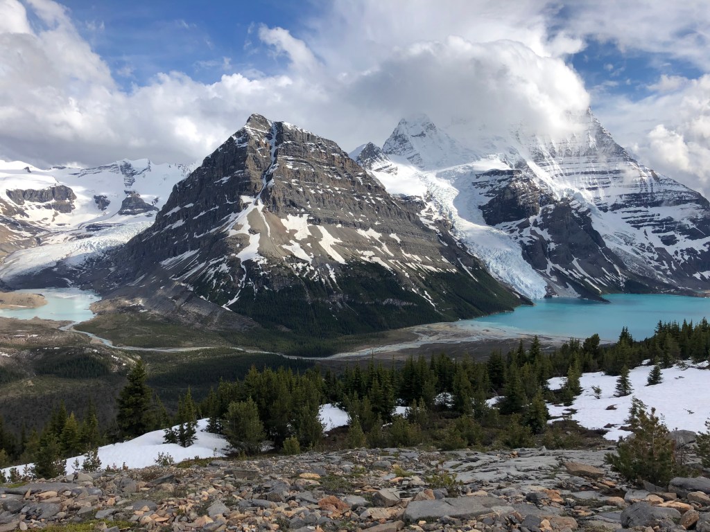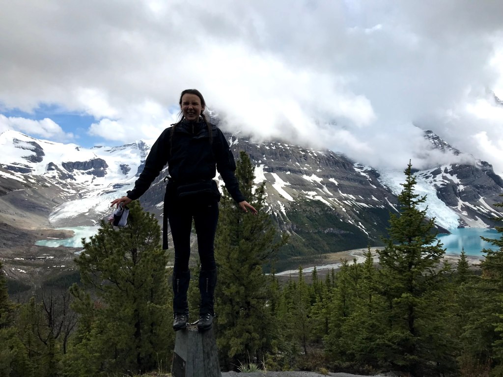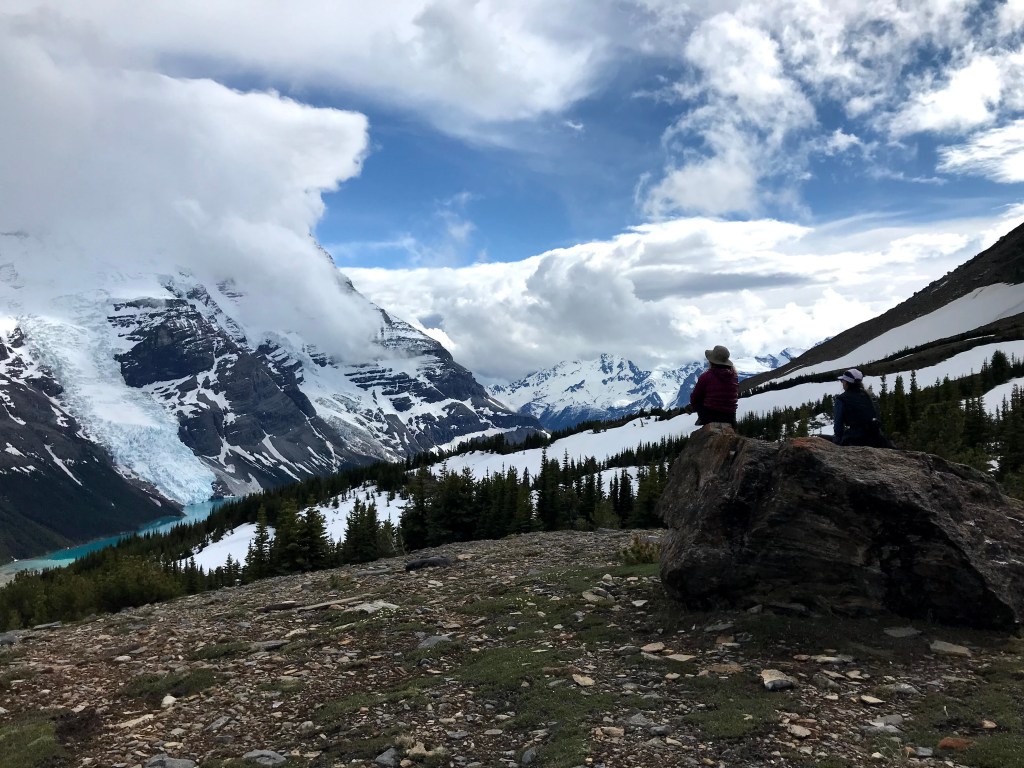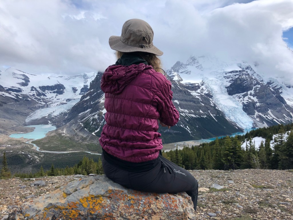 Courtney looking at Robson Glacier and lake on the left and Berg Lake, Berg Glacier and Mount Robson on the right