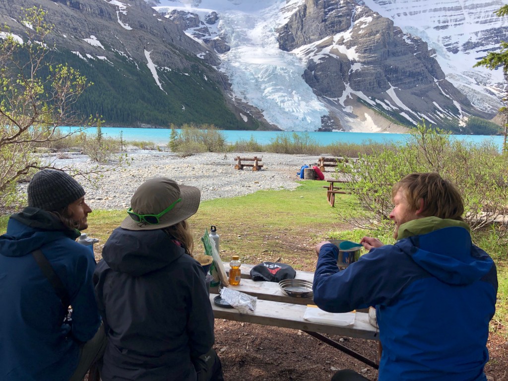 The final day would see us retrace our footsteps through the valley, without stopping at Kinney Lake to camp this time, back to the trail head. But we had one last morning of wilderness bliss: breakfast on a bench in front of Mount Robson, Berg Lake and Glacier.