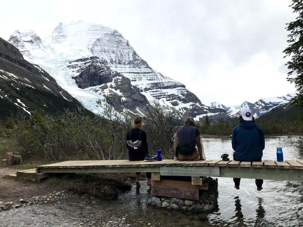 Soon after we had washed our sticky S’mores-fingers the sky cleared, Mount Robson’s snowy peak was visible and it was radiant in the last light of the day. We walked to the gravel flats in front of Berg Lake where we could sit, soak our tired feet in an ice cold glacial steam, and enjoy the incredible view.