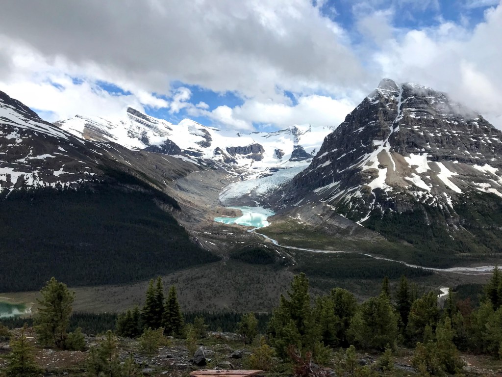 Our hike that afternoon gave us an opportunity to see this incredible scenery from above. We hiked up a steep trail through the trees until we were above the tree line, looking out over Mount Robson with a glacier either side of it, two lakes at the bottom of the glaciers and a river running between them.