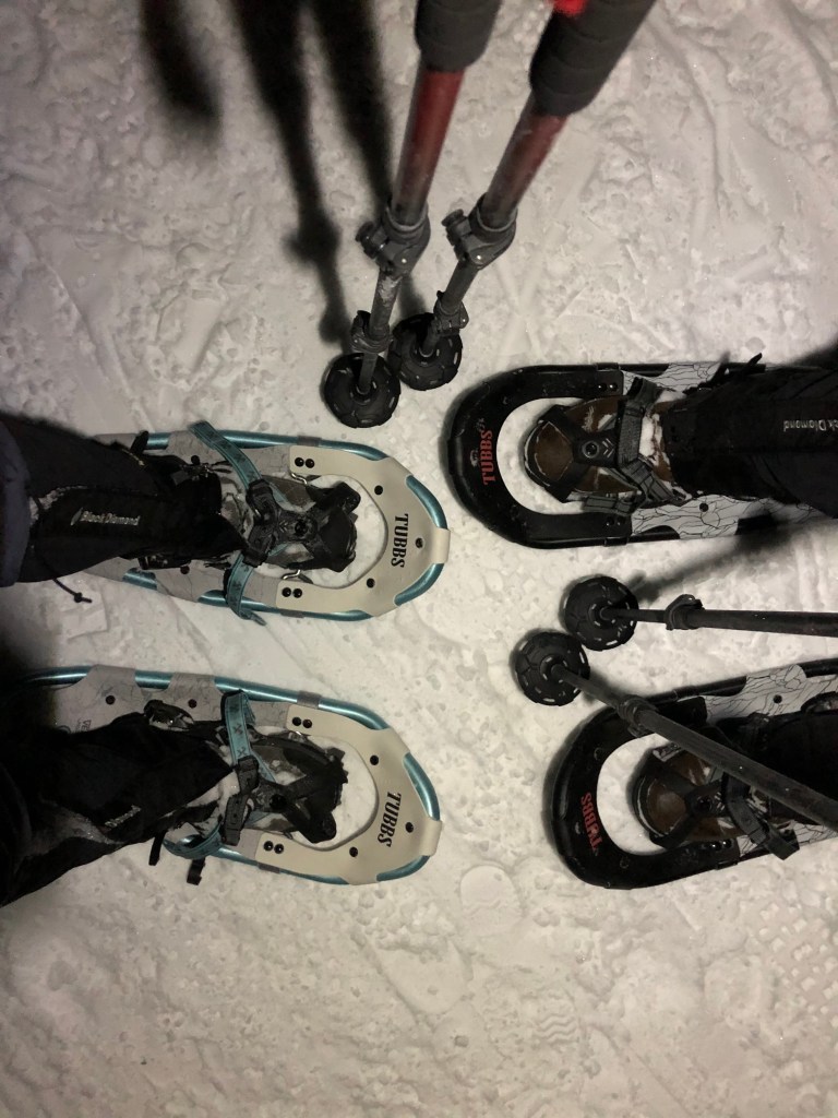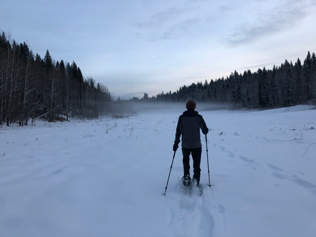 As you walk your feet sink into the snow with a satisfying ppppft sound. While you’re not quite walking on water as you may hope with such large feet, it is suddenly possible to make you way through deep snow that would have forced you to quit in just boots. Before we make our way towards a warm house and hot chocolate I can’t resist lying down for a moment in the snow to look at the hundreds of immensely bright stars framed by the two dark rows of trees.