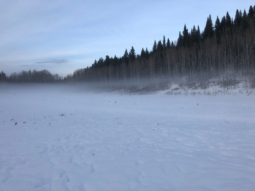 It is late afternoon when we emerge from the trees into the wide open space. I can’t help letting out a low ‘wow’. We have walked here quite a few times before but I have never seen it like it is today: covered in deep snow with the mist resting low in the meadow. We do a big loop testing our snow shoes in deep patches, then trying out walking uphill in among the trees.