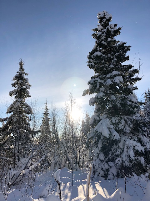 When we turn to make our way back down the meadow, towards home, the trees are glowing with the light from the cloud covered sun which is sinking behind them. The moon, a white crescent sits above the snow and the mist and the green tree tops, ready to take over. As we come out of the forest and remove our snowshoes for the five minute walk home, I think that this is the best thing about living in northern BC: being a few minuets walk from sights that spectacular.